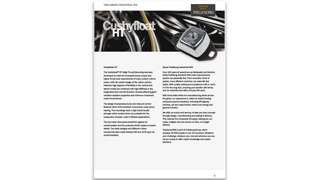 Cushyfloat HT(高推力)减振器可满足众多现代船舶动力装置不断增大的扭矩输出以及更高的推力载荷需求。经过精心设计的橡胶部分,垂向与横向的较高弹性与纵向高刚度相结合,可提供良好的隔振性能,并将推力作用下的位移减至最小。