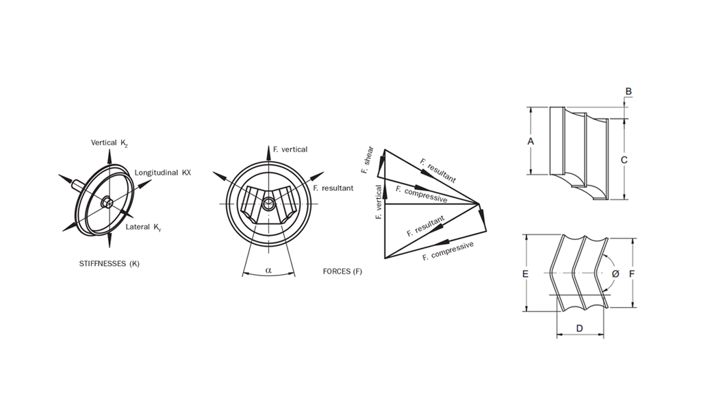 这里展示了三种灵活结构。弹簧以某个角度被倾斜固定在垂向轴上,加载时橡胶层会发生剪切和压缩。垂向的变形、载荷和所有刚度指的是一个轴箱上的两个人字簧。