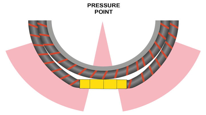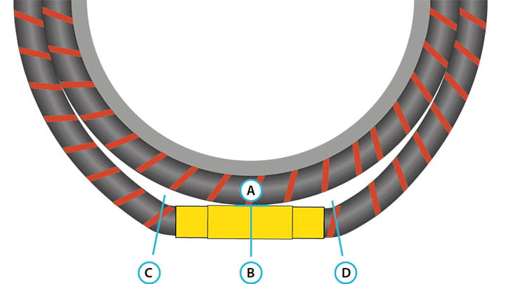 软管扭结应力是由不完全接触角的程度造成的。装有海工拉断阀的软管部分与内软管之间的总空间与软管疲劳风险之间存在很高的相关性(如上图中 C 两处所示)。