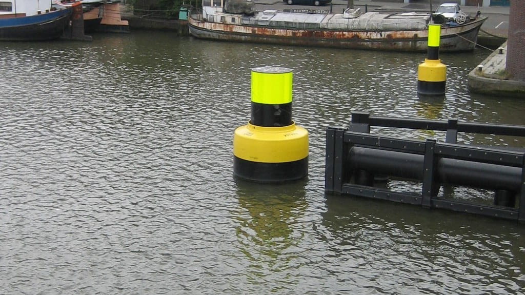模块式锚定悬索浮标含有可拆卸、可互换的模块,多个端部模块和中心模块相互独立,并装配到中央钢架上。这些模块通过定位法兰固定就位。