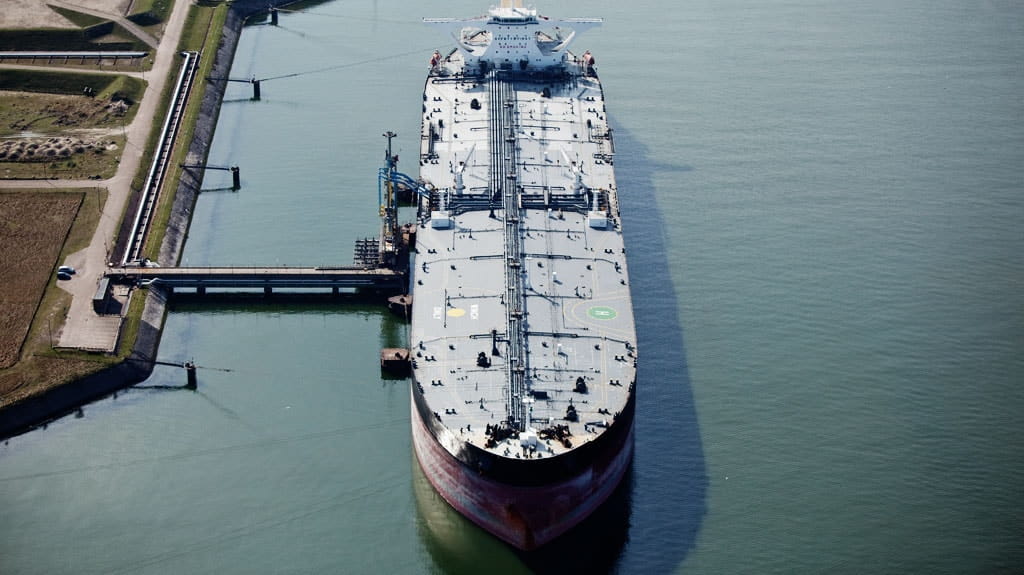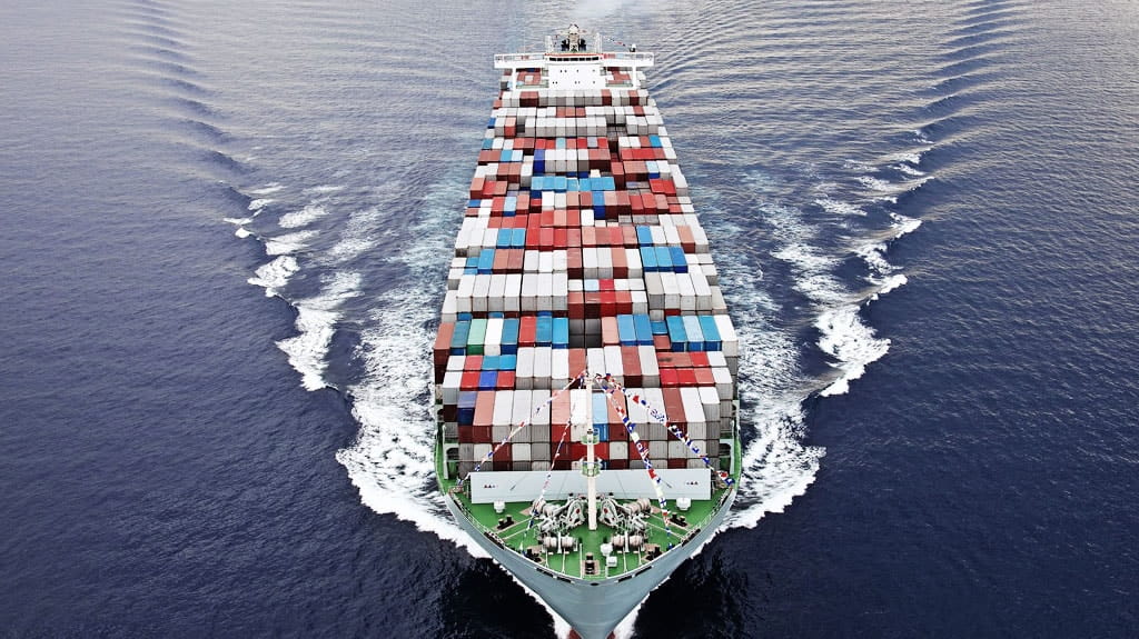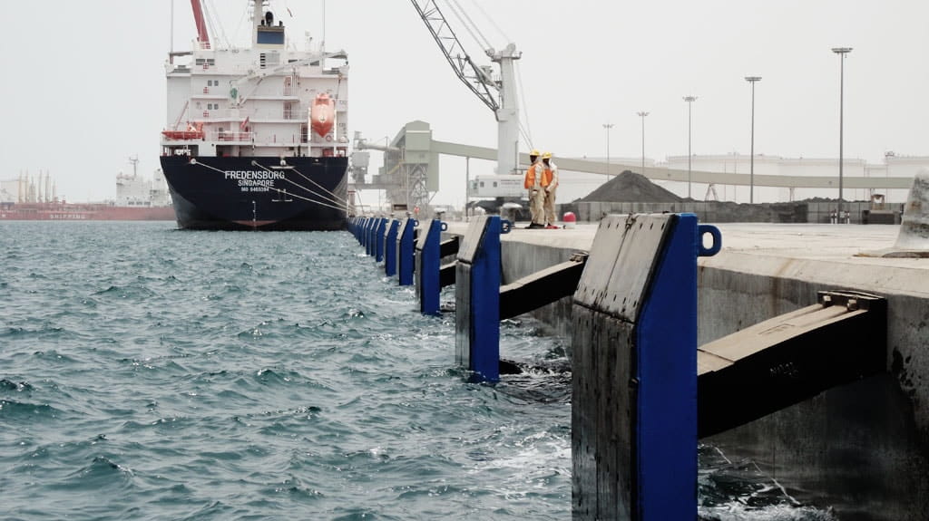 A large cargo ship is positioned in a dry dock at a shipyard, surrounded by scaffolding and heavy machinery. Workers are engaged in repair activities.